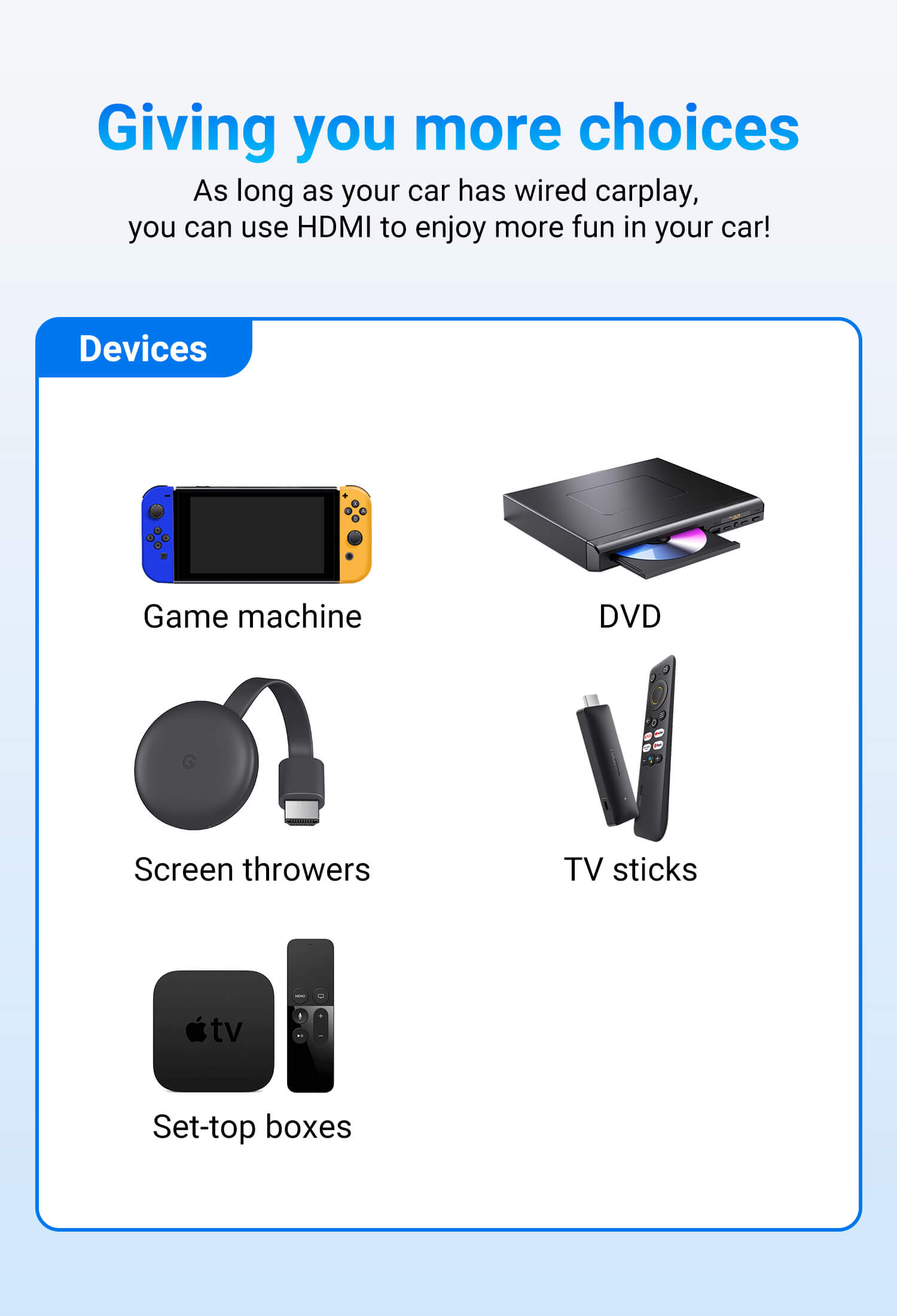💪 Simply plug in devices with HDMI outputs, such as game consoles, set-top boxes, and screen throwers, to transform your car into an entertainment hub